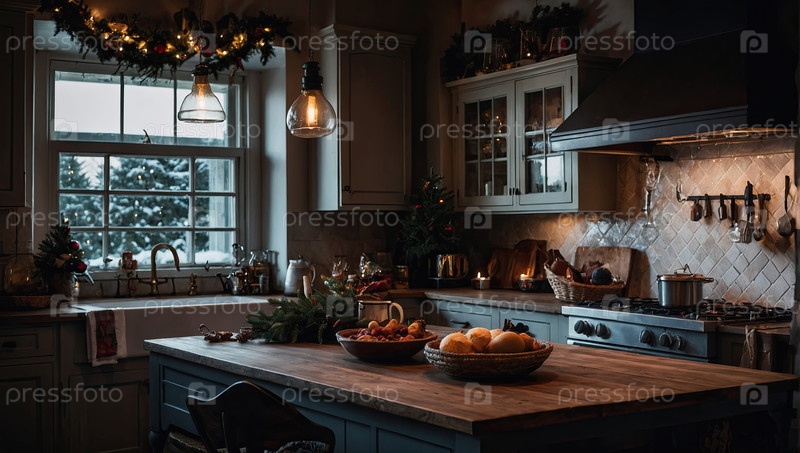 Темный интерьер уютной современной рождественской кухни, новогоднее настроение, подготовка к празднику, посуда. Рождественский декор деревенской кухни с приготовленным ужином. ИИ генерируется