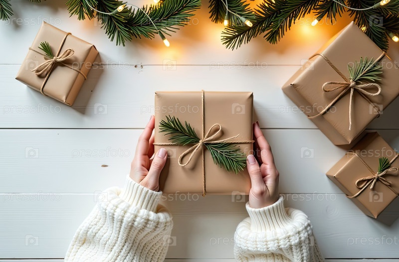 Упаковать подарок на Рождество и Новый год в крафт-бумаге, привязанный веревкой с луком с рождественским декором на белом столовом столе, натуральный декор. Праздничное настроение. Flatlay, background, copy space. AI generated