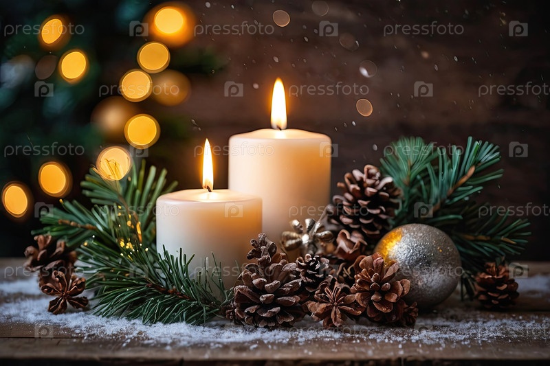 Рождественская открытка с кописпейсом на уютном деревянном столе с елкой, рождественскими шарами, свечами, конусами и блестками