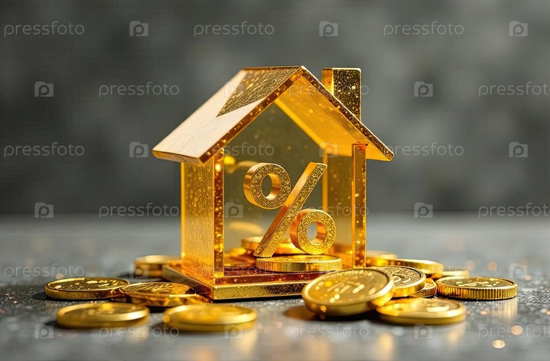 Золото светящийся символ процент в доме на стеке золотых монет на сером бетонном фоне. строительство жилья, скидка, купон, покупка, продажа, риэлторская деятельность, ипотека, страхование, бронирование. AI generated