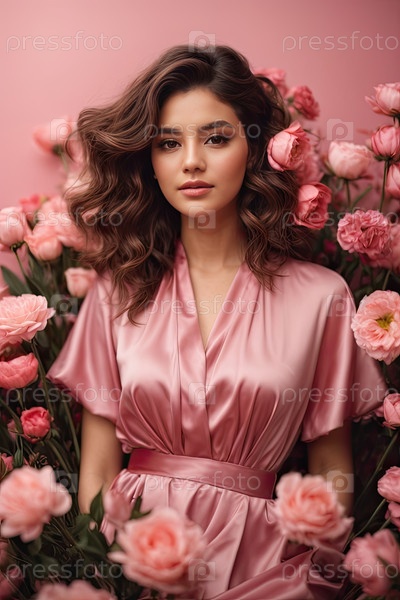 Женщина в шелковом розовом платье с розами, современная весенняя красота, элегантность и женственность, День женщины, цветочное вдохновение