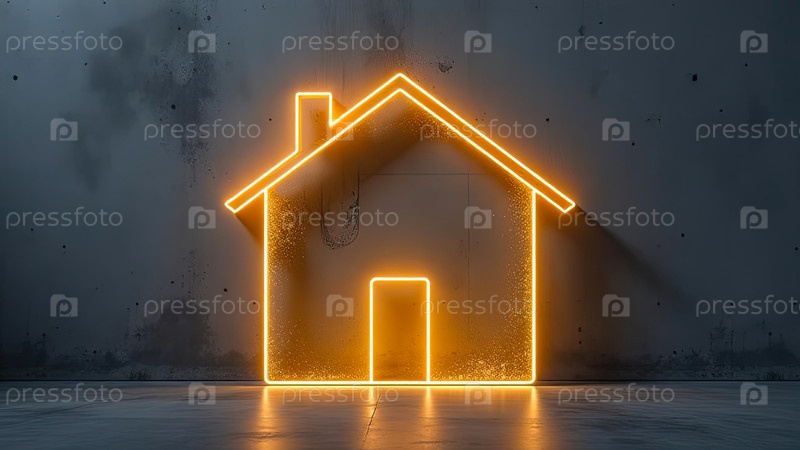 Прозрачное золото светящийся символ дома на сером бетонном фоне с золотым блеском. недвижимость, риэлтор, ипотека, страхование, бронирование, строительство, изоляция, отопление. ИИ генерируется