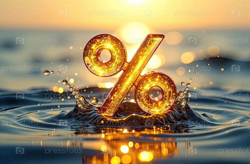Светящийся золотой процентный знак в освежающем брызге воды над водой. жаркие летние распродажи и скидки, горящие баннеры туров, листовки. ИИ генерируется