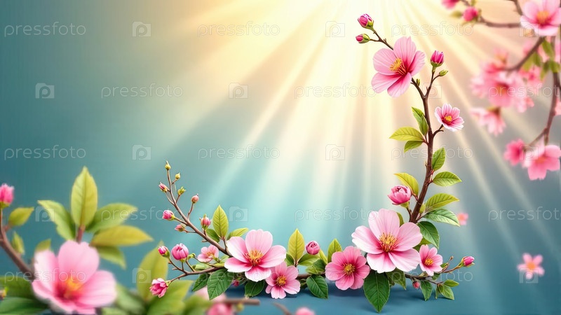 Весенняя тематическая декоративная рама с текстом внутри в солнечных лучах, украшена весенними пастельными цветами на весенне-синем фоне