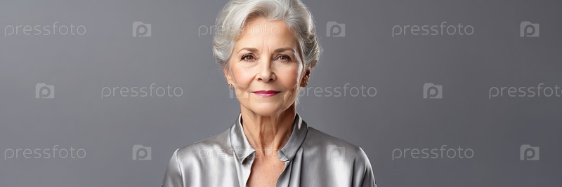 Пожилая женщина с короткими седыми волосами в серебряной блузке, задумчиво смотрящая со стороны, студийный портрет, элегантность, зрелое самоуверенность, изящное старение