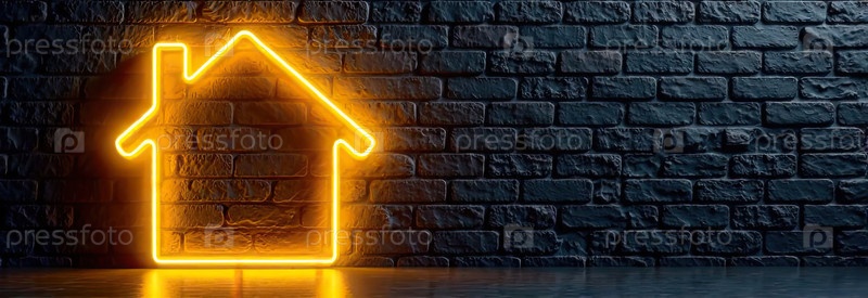 Прозрачное золото светящийся символ дома на фоне черной кирпичной стены с золотым блеском. недвижимость, риэлтор, ипотека, страхование, бронирование, строительство, изоляция, отопление. AI generated