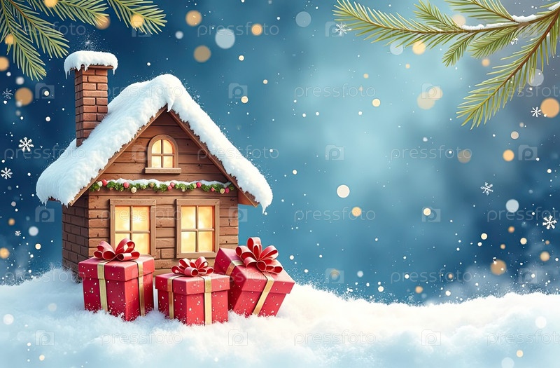 Уютный дом с акварелью и коробка для подарков под елкой на рождественском зимнем снежном фоне с золотыми блесками на поздравительных открытках. недвижимость, риэлтор, ипотека, страхование, бронирование. ИИ генерируется
