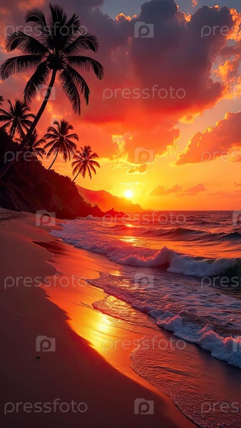 Тропический закатный пляж с пальмами, светящийся океан, яркие оранжевые тона, экзотический фон отдыха