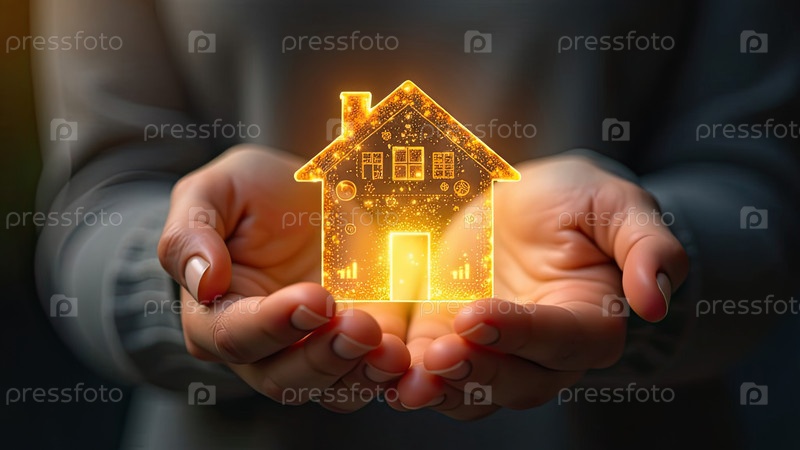 Золото светящийся символ уютного дома В ладонях рук с золотым блеском. Недвижимость, риэлтор, ипотека, страхование, бронирование, изоляция, мечта о собственном доме. ИИ генерируется