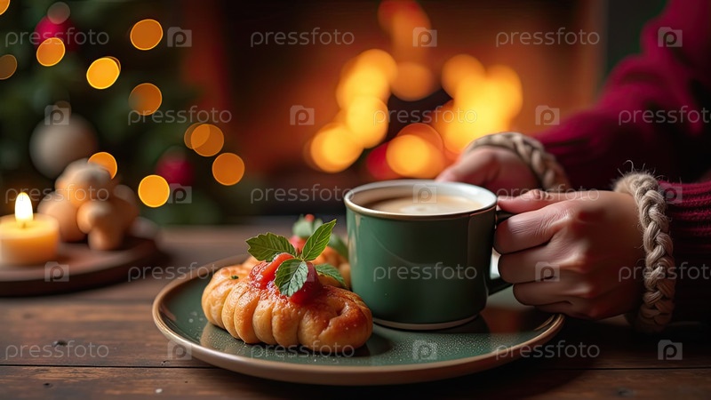 Теплая чашка кофе с кроасаном в руках, свитер возле камина.Уютная зима, Рождество, Новый год.Искусственный интеллект создан