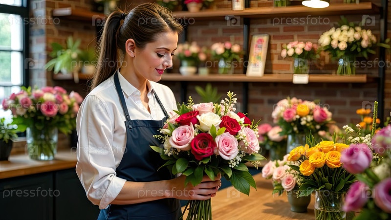 Букет роз и весенних цветов в руках флориста в интерьере цветочного магазина, доставка на праздник.Весна, 8 марта, женский день, день рождения.Искусственный интеллект генерирует