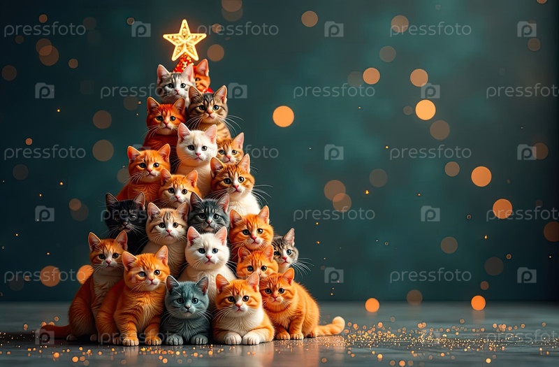 Рождественская елка из кошек сделана на праздничном фоне с блеском, многоцветная сотни котов складываются в форме высокой рождественской елки с золотыми светящимися гирляндными огнями