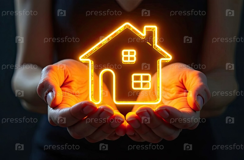 Золото светящийся символ уютного дома В ладонях рук с золотым блеском. Недвижимость, риэлтор, ипотека, страхование, бронирование, изоляция, мечта о собственном доме. ИИ генерируется
