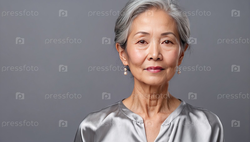 Портрет пожилой женщины с седыми волосами в серебряной блузке, нежно улыбающейся во время сидения в студии, положительное старение, уверенность пожилых людей, вневременная элегантность, концепция красоты