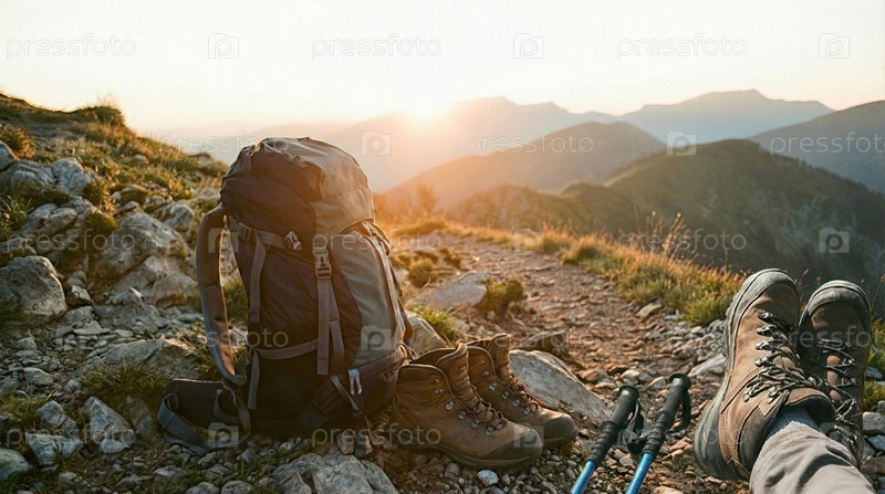 Рюкзак и туристические сапоги, отдыхающие на скалистой вершине холма при восходе солнца, сольное приключение, мирное мгновение, путешественное снаряжение, бегство в природу