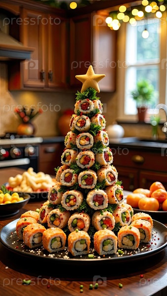 Аппетит быстрого питания в виде рождественской елки из рулонов, суши, красной рыбы на праздничном новогоднем столе. меню, рецепт и красивая презентация, доставка из ресторана. ИИ генерируется;