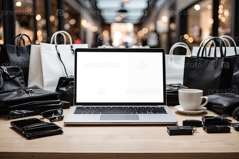 Ноутбук с белым экраном макет на столе в офисе в торговом центре рождественского декора с сумками, сумочками для покупок, пакетами, Черная пятница,