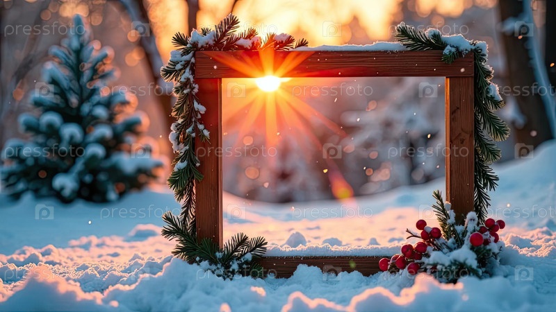 Рождественская рама на снегу с солнечным светом. поздравительная карточка на Рождество и Новый год с копировальным пространством и макетом. созданный ИИ