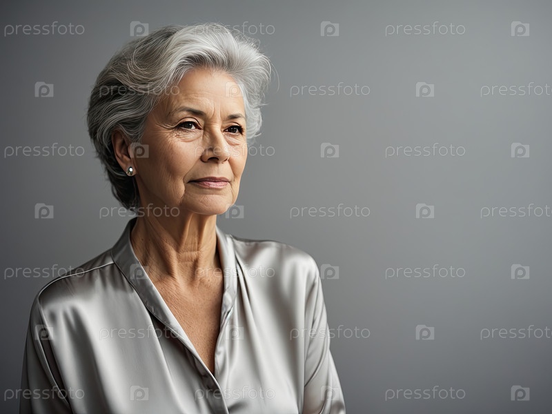 Уверенная старшая женщина с короткими серебряными волосами в блестящей блузке, смотрящая в сторону в студии, положительное старение, изящная элегантность, вечный шарм, зрелое вдохновение