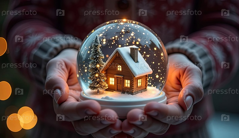 Магический стеклянный шар с крошечным современным домом и снегом внутри в уютной руке с рождественской елкой с гирляндами на фоне. страхование, ипотека, покупка недвижимости. ИИ генерируется