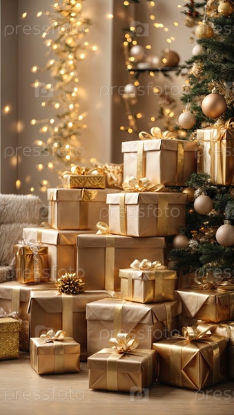 Рождественский фон с подарочными коробками с луками в ярких золотых тонах, боке и фейри-светом, рождественская елка во внутреннем интерьере дома. Праздничное настроение Рождество и Новый год, открытка. ИИ генерируется