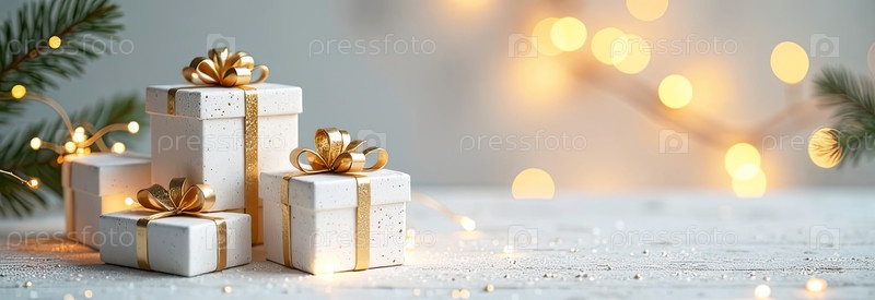 Рождественский фон с белыми коробками для подарков со золотыми лучами, светящимся боке и блеском. Праздничное настроение Карта на Рождество и Новый год с копировальным пространством. ИИ генерируется