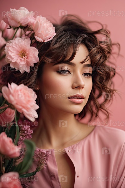 Молодая женщина с кудрявыми волосами в розовой блузке, окруженной розовыми цветами, выражающая нежную женственность и весеннюю красоту, цветочное вдохновение, День женщины
