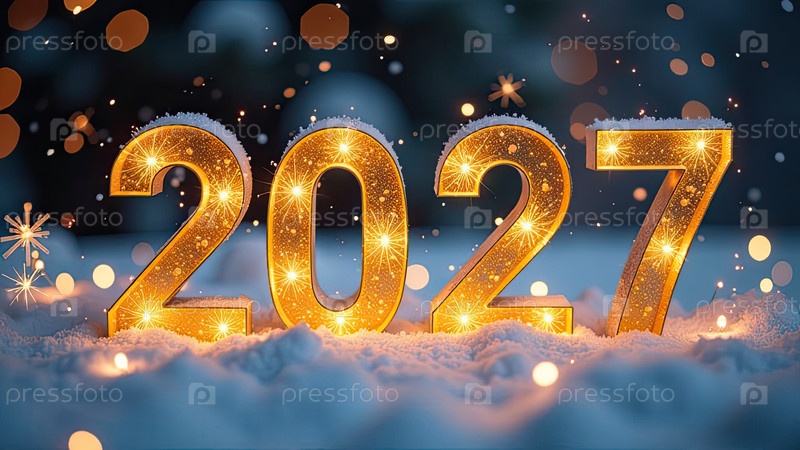 Прозрачные золотые светящиеся числа 2027 на снежном фоне Нового года с золотистыми гирляндами боке, секины, звезды, снег, блеск. Поздравления, открытка. Календарь, обложка. AI generated