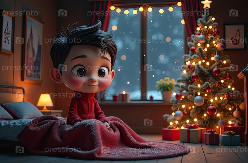Ребенок в постели Уютная спальня с рождественской елкой и теплыми гирляндами света и свечами - вид из окна зимой и снегом