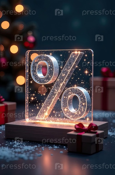 Неон светящийся золотой процентный знак на рождественском фоне с елкой, блесками и коробками для подарков. витрина магазина в Черную пятницу, Новый год, Рождественская распродажа, скидки. баннер, флаер. ИИ генерируется