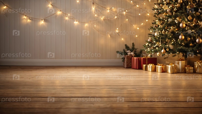 Пустой деревянный пол в коричневых и золотых тонах для отображения продукции со стеной во внутренней части комнаты, с рождественским декором. Копирование пространства, Рождество и Новый год. ИИ генерируется