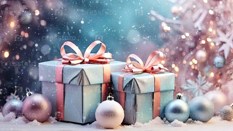 Рождественский фон с подарочными коробками с лучами в нежных розовых, бежевых, синих тонах, боке и фейри-свете. Праздничное настроение Рождество и Новый год. ИИ генерируется