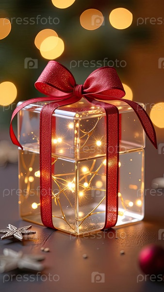 Золотая прозрачная светящаяся коробка для подарков на праздничном фоне с гирляндами боке с пространством для текста. Поздравления, открытки, фон Рождества и Нового года. ИИ генерируется