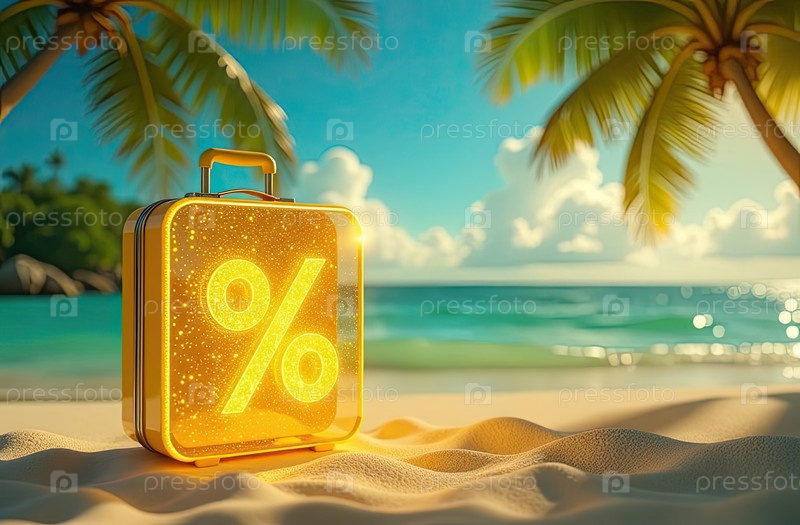 Золотой светящийся знак процент И желтый чемодан на берегу моря с тропическими пальмами под ярким солнцем, океанический закат в фоне. Горячие летние распродажи и скидки, горячий туристический баннер, листовка. AI генерируется