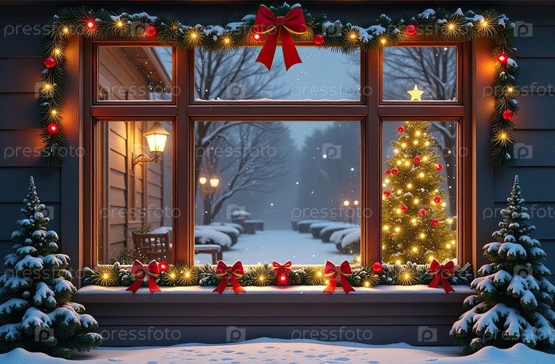 Наружное уютное окно с рождественским декором и теплым светом внутри - вид снаружи дома. отпразднуйте Рождество и Новый год, елку, боке, снег. созданный ИИ