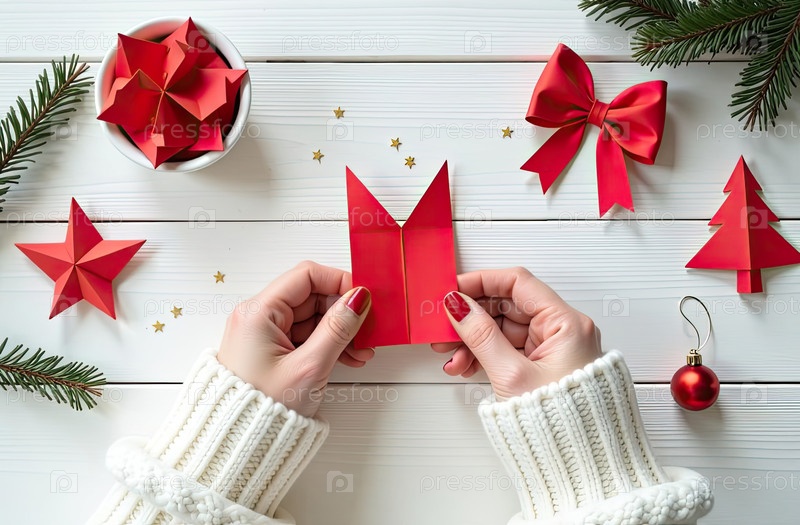 DIY оригами-бумага своими руками на Рождество и Новый год, с рождественским декором на белом столе из доски, натуральный декор. Праздничное настроение. Flatlay, background, copy space. AI generated