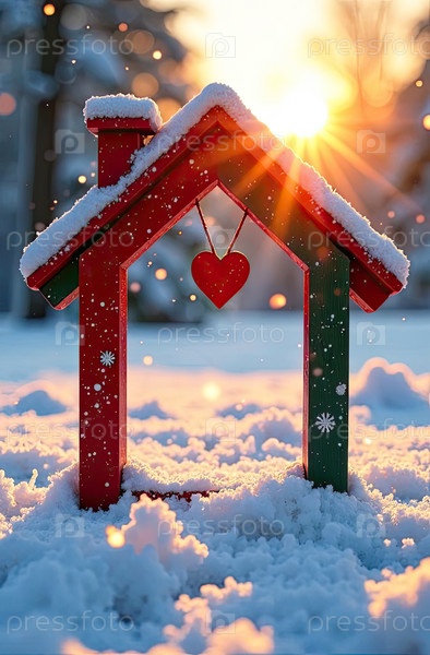 Уютный красный крошечный дом на снегу в солнечных лучах, украшенный красным сердцем и декором Валентина