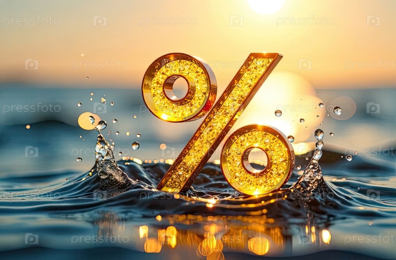 Светящийся золотой процентный знак в освежающем брызге воды над водой. жаркие летние распродажи и скидки, горящие баннеры туров, листовки. ИИ генерируется
