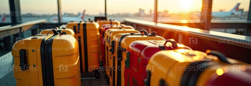 Куча желтых и красных чемоданов в аэропорту - контроль грузов, допускаемый багаж и параметры ручной клади на самолете, охрана, регистрация и доставка личных вещей
