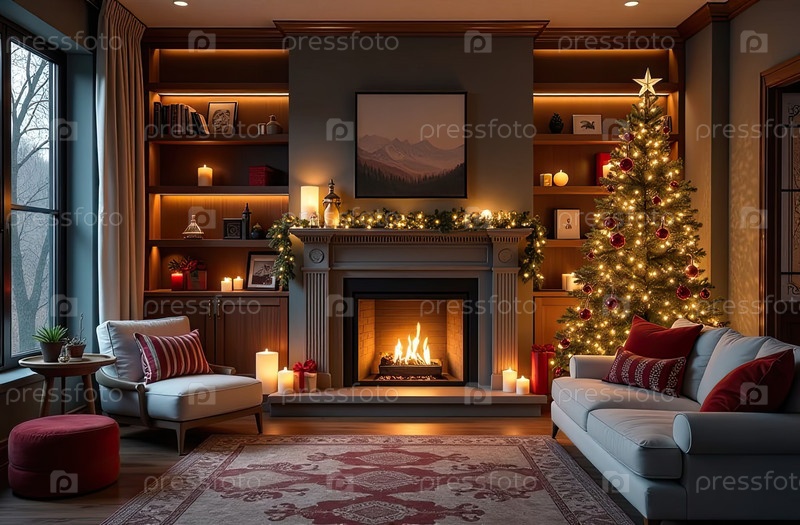 Современный яркий интерьер гостиной дома с камином с рождественским декором, теплыми золотыми огнями гирлянд, большими окнами со снегом и зимой