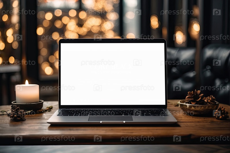 Ноутбук с белым экраном макет на столе в офисе рождественского декора с огнями боке, свечами, сверхурочной работой по праздникам, домашний офис, черная пятница,
