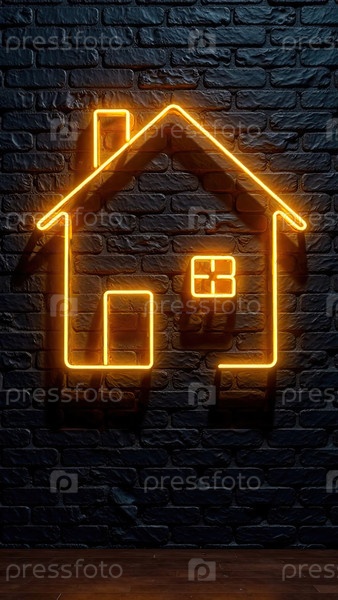 Прозрачное золото светящийся символ дома на фоне черной кирпичной стены с золотым блеском. недвижимость, риэлтор, ипотека, страхование, бронирование, строительство, изоляция, отопление. AI generated