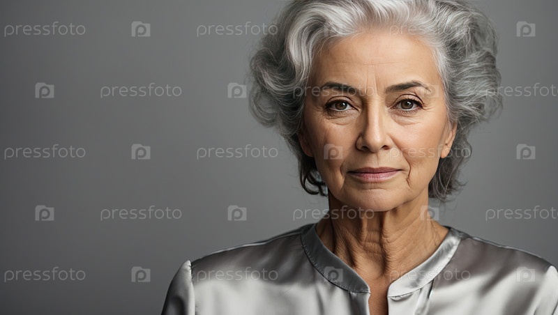 Пожилая женщина с короткими кудрявыми седыми волосами в серебряной блузке, уверенно улыбающаяся на портрете студии, положительное старение, элегантный стиль, зрелая грация, вневременная красота