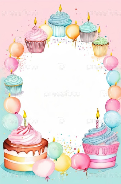 Круглый акварельный каркас с кексами и воздушными шарами, открытка на день рождения или приглашение границы, копировать пространство в центре
