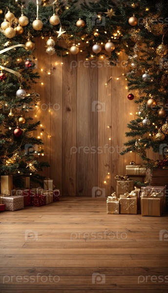 Пустой деревянный пол в коричневых и золотых тонах для отображения продукции со стеной во внутренней части комнаты, с рождественским декором. Копирование пространства, Рождество и Новый год. ИИ генерируется
