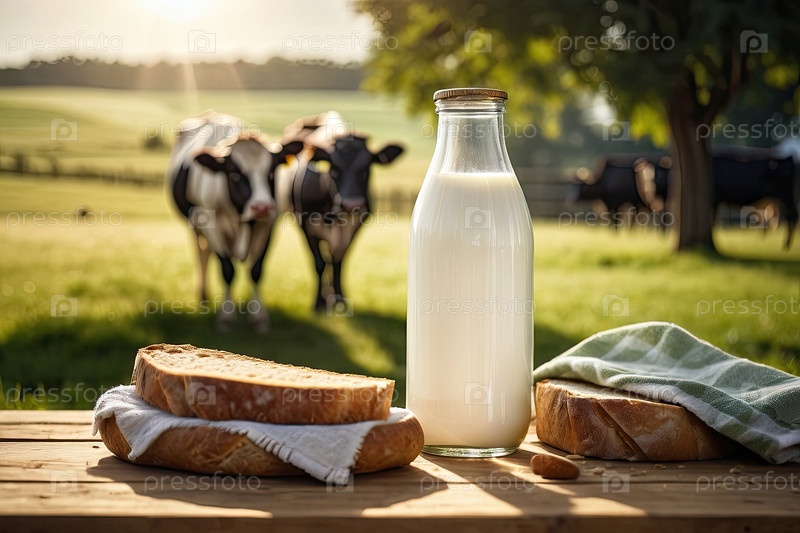 Свежее деревенское коровье молоко в кружке и белый ароматный хлеб и выпечка на столе на фоне луга, где пасутся коровы