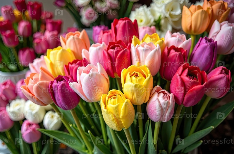 Красочные букеты тюльпанов в цветочном магазине - свежерезанные цветы на складе и стеллажи для продажи, доставка к празднику. весна, 8 марта, женский день, день рождения. ИИ генерируется