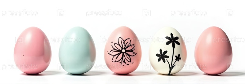 Внизу изображения пять яиц со свободным пространством сверху для текста, творческий цветочный черный рисунок на цветах-яйцах, белый фон. Пасхальный баннер с пробелом для текста. ИИ генерируется