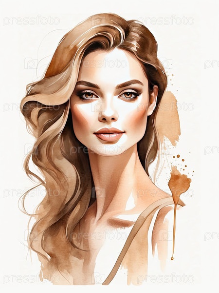 Акварельная иллюстрация женщины с сияющей кожей и идеальным фундаментом, искусство макияжа, гладкий цвет лица, мягкий тон, концепция ухода за красотой