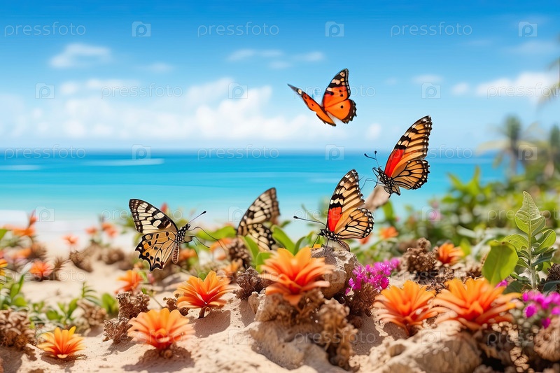 Горизонтальное летное побережье с оранжевыми цветами, бабочками, голубым океаном, мягким песком, большим пространством для заголовков или рекламы